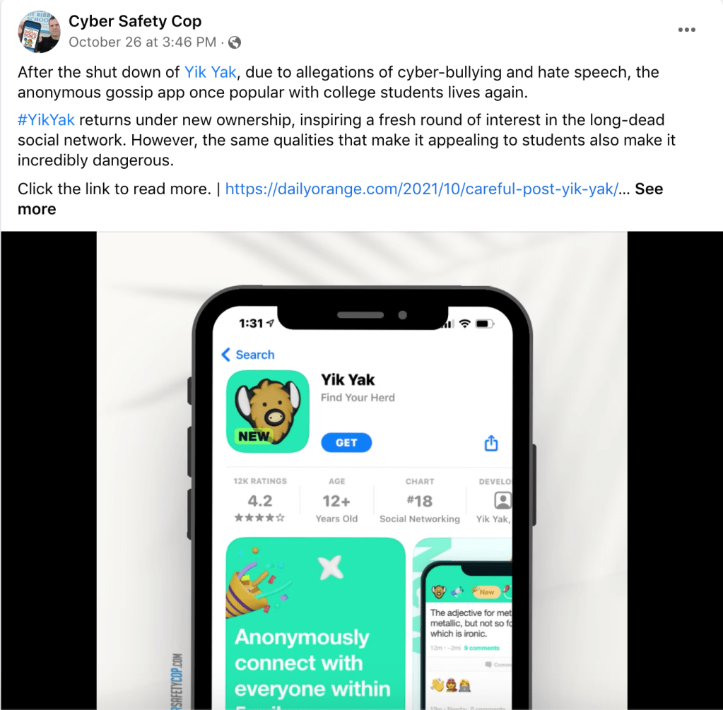 Yik Yak is a social media platform similar to Twitter except all users remain anonymous allowing people to post virtually anything they want to a thread that all users within a certain mile radius can view. The social media application’s main takeaway is the ability to post anonymously to a public thread. The app does not require a user to enter any personal information besides their email address. No users on the app have a username. The app promotes people to confide in each other anonymously but unfortunately, users often abuse this feature by posting inappropriate comments or lies about individuals and groups.